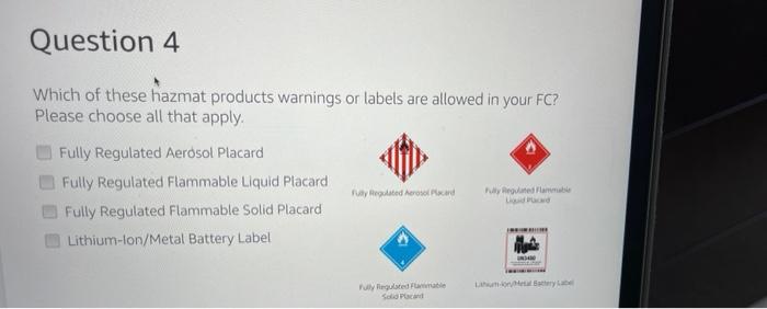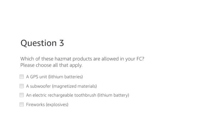 Dangerous goods (also called hazmat) are substances or materials that may pose a risk during storing, handling, or transporting because they contain flammable, pressurized, corrosive, or otherwise harmful substances. To prevent potential health and safety risks, amazon gathers dangerous goods information related to any products sold on amazon. Hazmat allowed in our fc. ( my description of these items) flame. Which of these hazmat products are allowed in your fc? Arrow_forward product packaging is used as an effective tool by marketers to attain a ‘just noticeable difference’ (jnd) from among a host of competing products. Question 4 which of these hazmat products warnings or labels are allowed in your fc? Please choose all that apply. A gps unit (lithium batteries) a subwoofer (magnetized materials) a can of hairspray (flammable/aerosols) fireworks (explosives) which of these hazmat products warnings or labels are allowed in your fc?